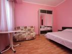 VIР "студио" (расположен на пятом этаже, номер оснащен сплит-системой кондиционирования, деревянной двухспальной кроватью, большим ТВ, плат. шкафом, туалетвом столиком, комодом, мягким уголком, совмещенным савузлом с душем "Шарко", прикроватными тумбочками, столом, стульями, холодильником, эл. чайником, в пользование гостей предоставляются полотенца, туалетная бумага, мыло, посуда первой необходимости, минибар (соки, мин. вода, пиво, вино, конфеты, фрукты). В номере производится ежедневная влажная уборка и смена белья, полотенец. По желанию клиента - питание в номер.